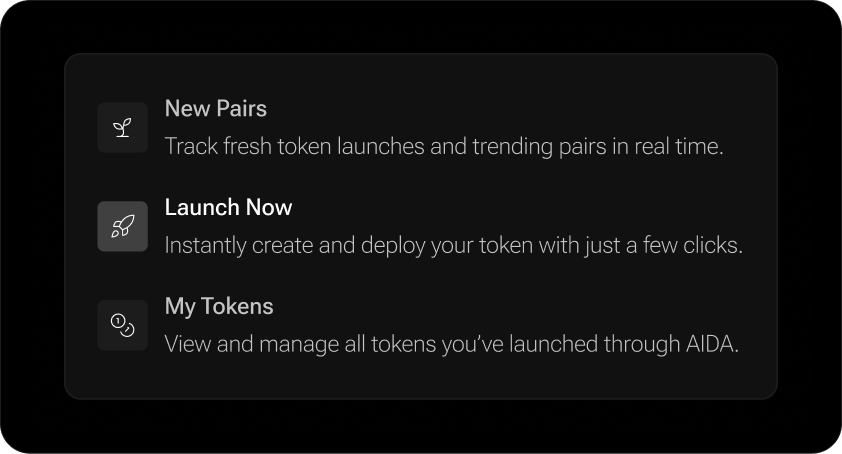 Creating and launching your own memecoin, AI Agent, or community token is now radically simplified with AIDA.
