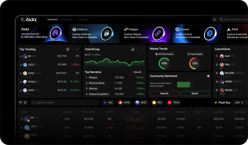 The AIDA Dashboard is your control panel for everything happening on-chain. It gives you instant access to key trading data, token launches, and market sentiment - all in one place.
