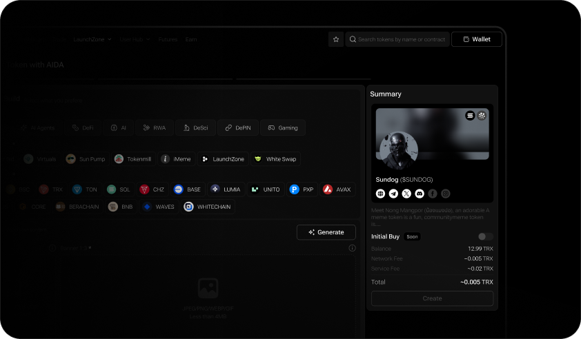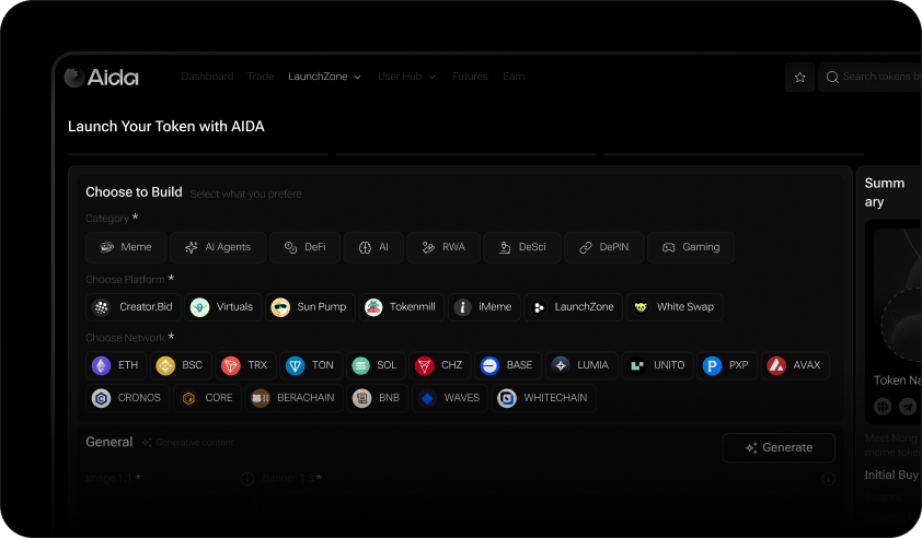 Creating and launching your own memecoin, AI Agent, or community token is now radically simplified with AIDA.