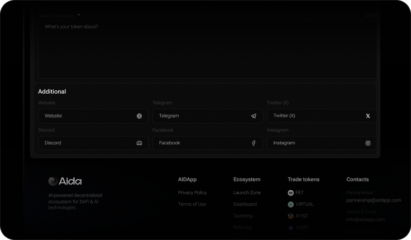 AIDA lets you attach key social links directly to your token - so traders and fans can find your Telegram, X (Twitter), Discord, website, and more from day one.